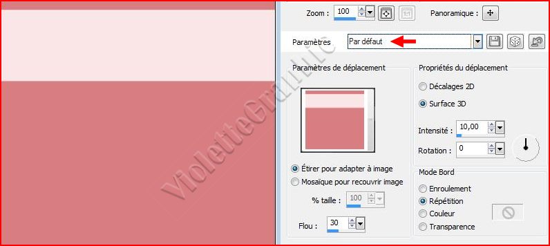 3 - Effets/Effets de distorsion/Paramètres de déplacement réglages par défaut : **Ouvrir la liste déroulante des différents paramètres :