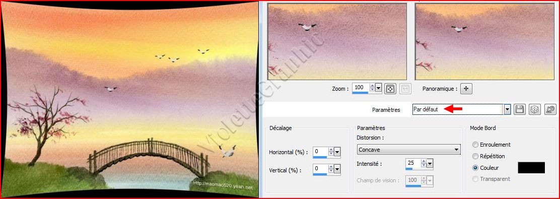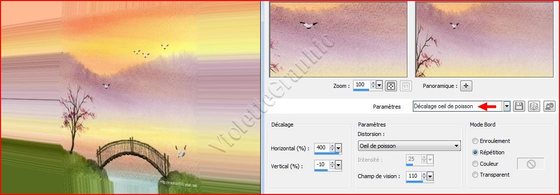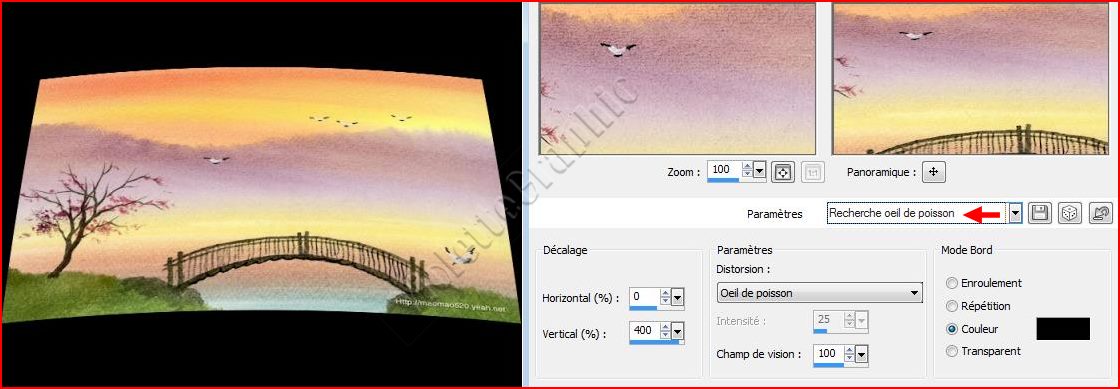 5 - Effets/Effets de distorsion/Distorsion de l'objectif réglages suivants Décalage œil de poisson / mode Bord: répétition