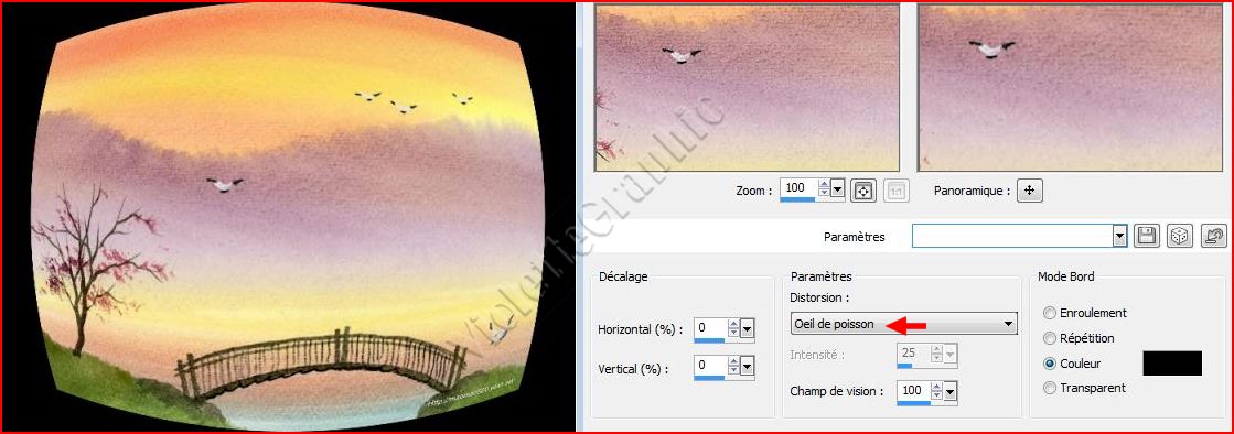 6 - Effets/Effets de distorsion/Distorsion de l'objectif réglages suivants œil de poisson // mode Bord: couleur