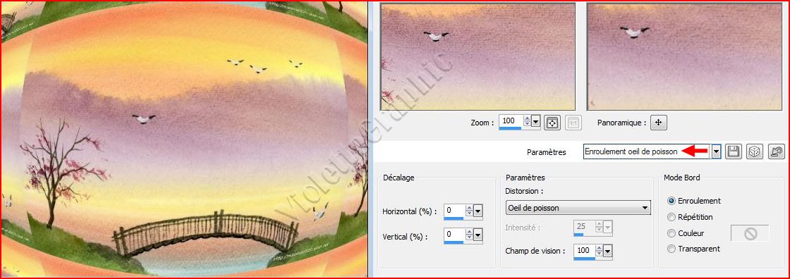 6 - Effets/Effets de distorsion/Distorsion de l'objectif réglages suivants œil de poisson/ mode Bord: enroulement