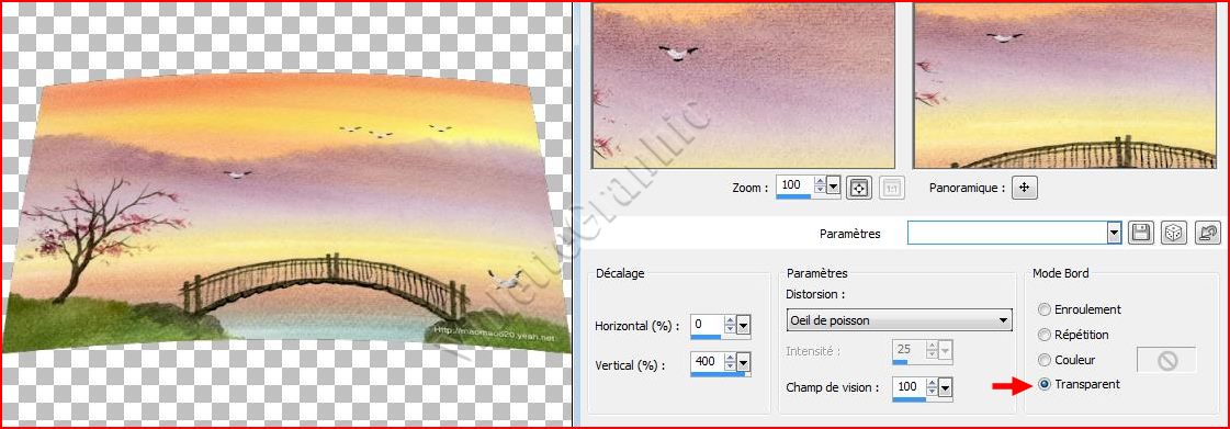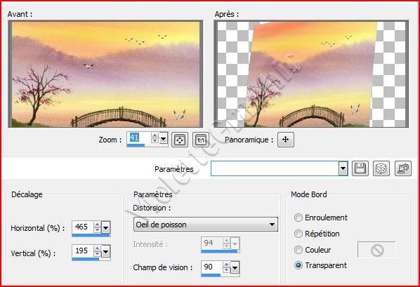 7 - Effets/Effets de distorsion/Distorsion de l'objectif réglages suivants œil de poisson / mode Bord: transparent
