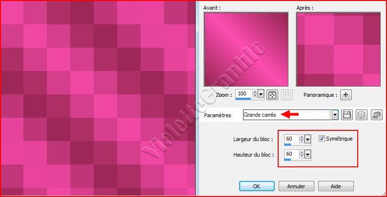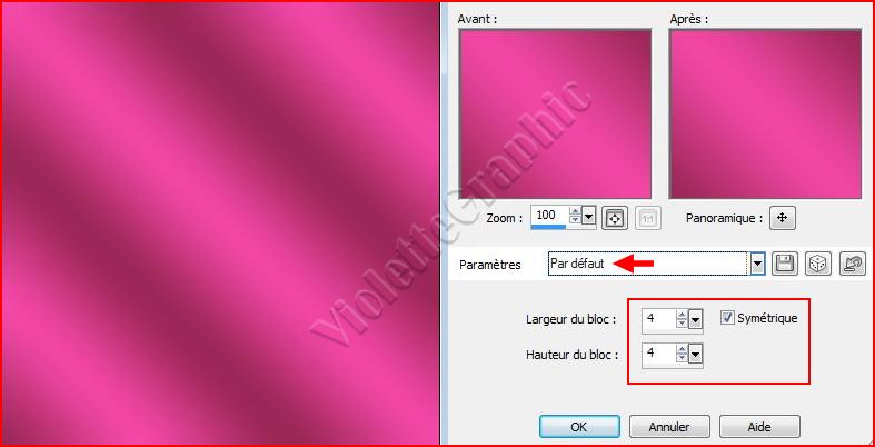 3 - Effets/Effets de distorsion/pixellisation réglages suivants : Paramètres de la grille : Blocs de grande taille