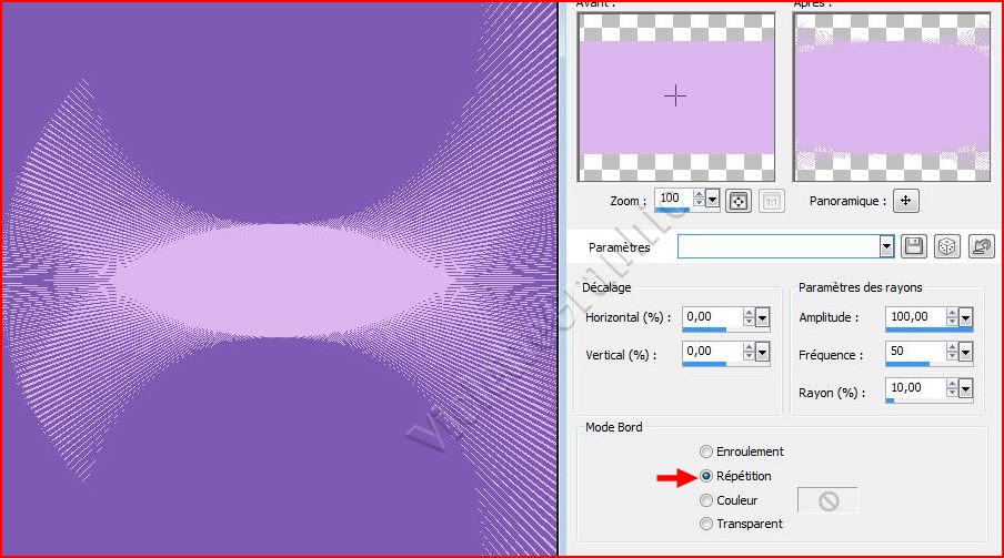 6 - Effets/Effets de distorsion/Rayonnement réglages suivants : en Mode de bord : Répétition
