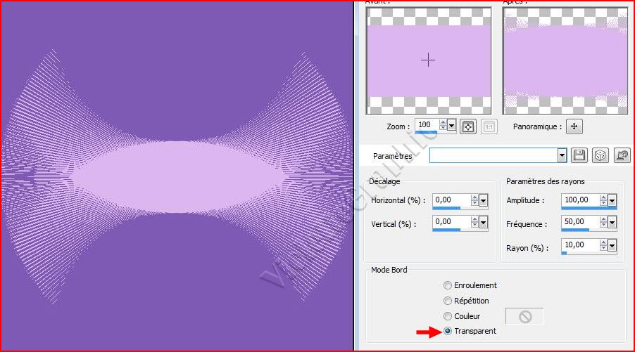 Horizontal : permet de déplacer le centre de l’onde Vertical : permet de déplacer le centre de l’onde Amplitude : permet de définir la hauteur apparente des vagues Fréquence : permet de définir le nombre de rayons de chaque quart de cercle. Rayon : permet de définir la distance de la vague par rapport au centre Couleur : permet de choisir la couleur des pixels hors limites Transparent : permet d’appliquer une couleur transparente aux pixels hors limites (disponible uniquement pour les images contenant plusieurs calques).