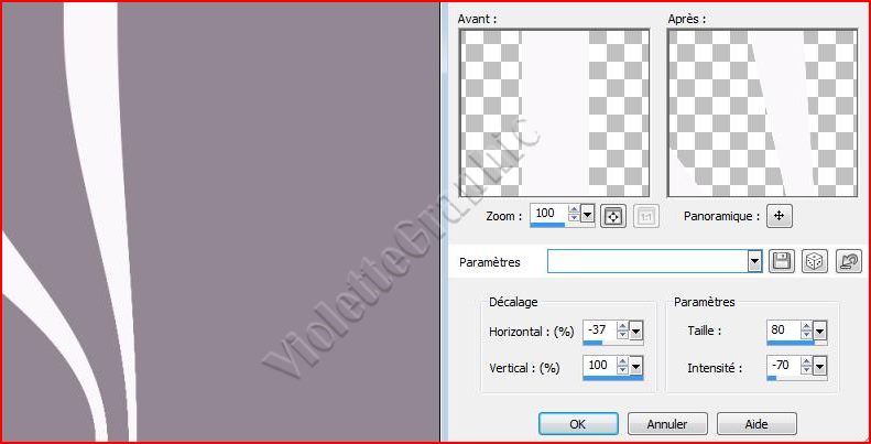 4 - Effets/Effets de distorsion/Miroir Déformant réglages suivants : Horizontal : -37 Vertical : 100 Taille : 80 Intensité : -70