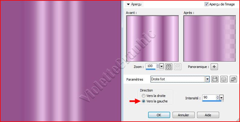 Pavé Direction : permet de sélectionner la direction Vers la droite ou Vers la gauche Intensité : permet de définir l’intensité de la déformation Augmentez l’intensité pour rendre l’image plus floue