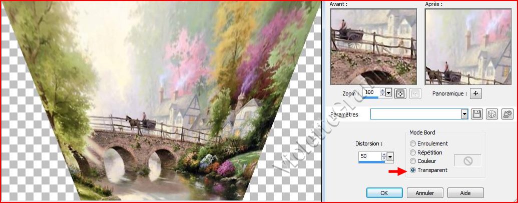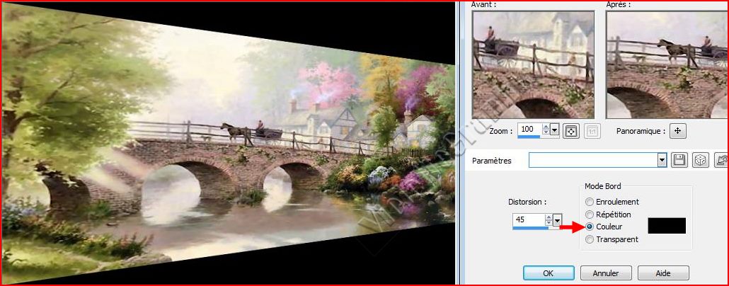 Distorsion : permet de définir la longueur entre le bord raccourci et le bord inchangé Plus elle est forte, plus l'image est déformée et le côté diminué est réduit à un point