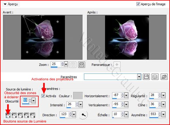 *** Effets/Effets d'éclairage/Projecteurs : Ouvrir la liste déroulante des différents paramètres :