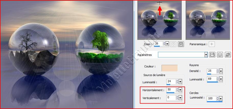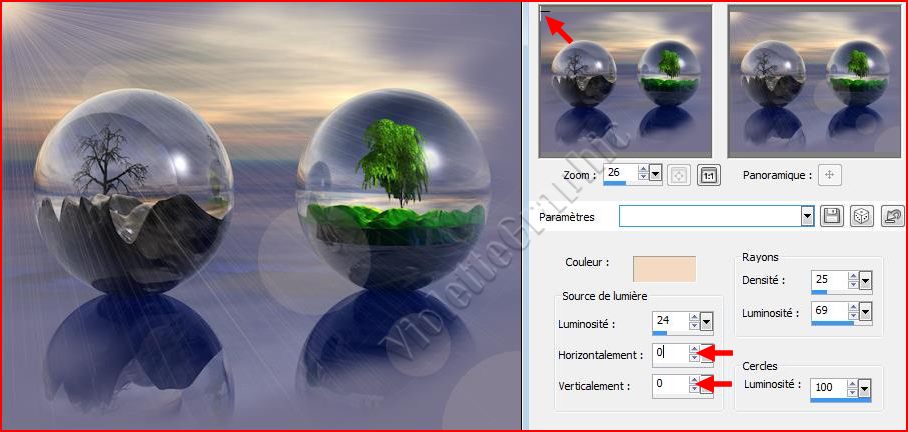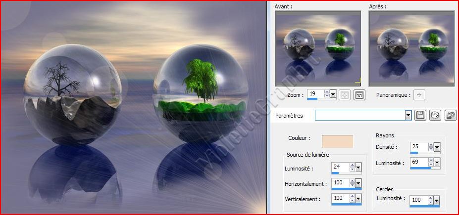 **position horizontale : 0/ position verticale : 0 clic droit avec la pipette sur le carré de couleur pour choisir votre couleur ici: beige clair Rayons : Densité/ Luminosité à 24 Luminosité source de lumière : 69 Luminosité cercles à 100 le hallo est dans le coin supérieur gauche