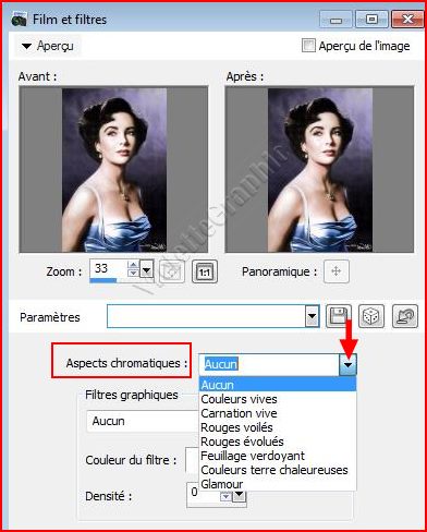 Nous avons plusieurs aspects chromatiques à notre disposition: Couleurs vives : Augmente la saturation et le contraste d’une photo pour rendre les couleurs plus vives Carnation vive : Rehausse la couleur de la peau ( Portraits ) Rouges voilés : Atténue les rouges Rouges évolués : Rehausse les rouges Feuillage verdoyant : Rehausse les bleus et les verts ( Paysages ) Couleurs terre chaleureuses : Rehausse les rouges, les oranges et les jaunes ( Paysages ) Glamour : Donne un léger éclat ( Portraits )