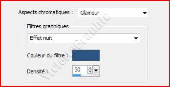 4 - Reprenez votre image Choisir l'aspect chromatique : Glamour un filtre : Effet nuit Préréglages: Choisir une couleur de filtre personnalisée : bleue Entrez une valeur dans la case Densité : 30