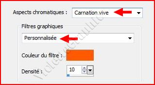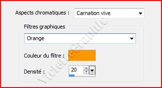5 - Activer les choix suivants : Choisir l'aspect chromatique : Carnation Vive un filtre : Orange Préréglages: Choisir une couleur de filtre personnalisée : jaune/orangée Entrez une valeur dans la case Densité : 20