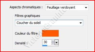 6 - Ouvrir la photo du paysage Activer les choix suivants : Choisir l'aspect chromatique : Feuillage Verdoyantun filtre : Coucher de soleilPréréglages: Choisir une couleur de filtre personnalisée : jaune/orangée Entrez une valeur dans la case Densité : 30