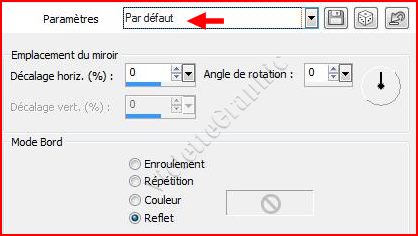 Décalage horizontal : permet d’éloigner le centre de la ligne de reflet du centre de l’image Décalage vertical : permet d’éloigner le centre de la ligne de reflet du centre de l’image Angle de rotation : permet de définir l’angle de rotation de la ligne Enroulement : une mosaïque est répétée à l’infini dans chacune des directions de l’image Répétition : détermine le pixel de bord de chaque contour et le répète à l’infini vers l’extérieur Couleur : permet de choisir la couleur des pixels hors limites Reflet : reflète le pixel du bord sur chaque côté