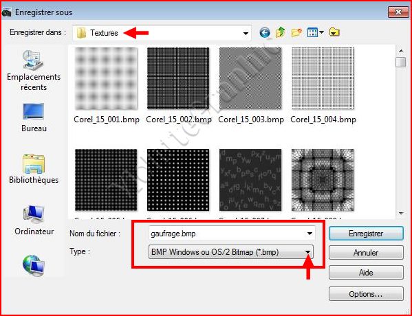 4 - Fichier /Enregistrer sous : Ouvrez votre dossier textures de Corel PaintShop Pro nommer votre fichier : gaufrage.bmp