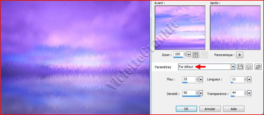 7 - Effets/Effets de Textures/Stores /Réglages suivants: Mes choix : Flou minimum Densité maximum Longueur minimum Transparence élevée