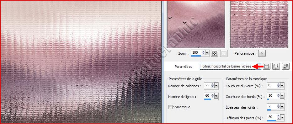 6 - Effets/Effets de Textures/Mosaïque de verre/avec ces réglages: Portrait horizontal de barres vitrées Nombre de colonnes : minimum Nombre de lignes : élevée
