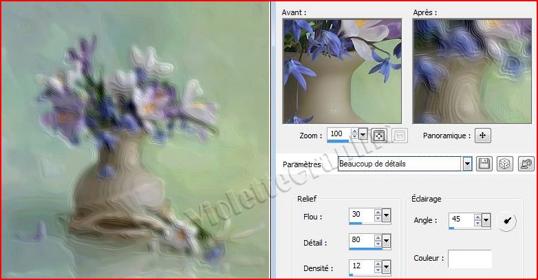 Flou : permet de déterminer la douceur de l’image d’origine Détail : permet de définir l’échelle du relief Densité : permet de définir le nombre de zones de relief Angle : détermine les bords apparaissant clairs ou ombrés Couleur : permet de choisir la couleur de la lumière éclairant le bord des formes