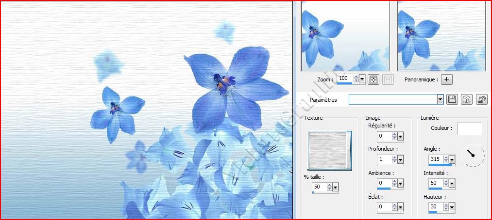 Échantillon Texture : permet de choisir la texture Taille : permet de redimensionner la texture à un pourcentage de sa taille d’origine Régularité : permet de définir l’inclinaison (la netteté) et l’épaisseur des bords Profondeur : permet de définir la hauteur des bords Ambiance : permet de régler la luminosité globale de l’image Éclat : permet de définir le pouvoir réfléchissant de la surface Couleur : permet de choisir la couleur de la lumière éclairant l’image Angle : détermine les bords apparaissant clairs ou ombrés Intensité : permet de régler la luminosité de la lumière Élévation : indique l’angle de la hauteur à laquelle la source de lumière se trouve au-dessus de l’image