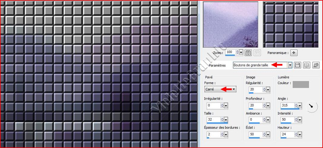 2 - Effets/Effets de Textures/Mosaïque réglages suivants: Boutons de grande taille= carré