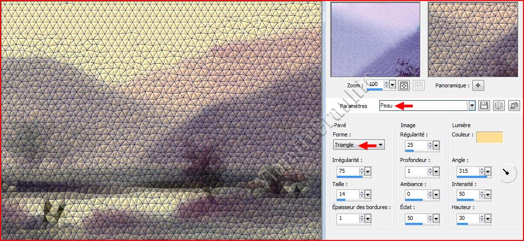 5 - Effets/Effets de Textures/Mosaïque réglages suivants: Peau : triangle