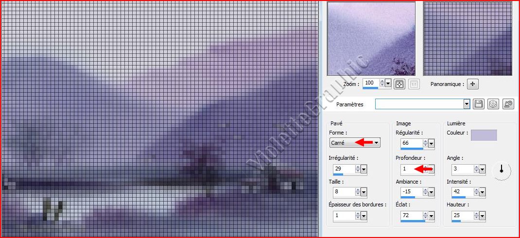 Forme : permet de sélectionner un pavé triangulaire, carré ou hexagonal Irrégularité : permet de redonner forme aux pavés Taille : permet d’augmenter ou de réduire la taille des pavés Épaisseur des bordures : permet de définir le joint, c’est-à-dire l’espace situé entre les pavés Régularité : permet de définir l’inclinaison (la netteté) et l’épaisseur des bords Profondeur : permet de définir la hauteur des bords Ambiance : permet de régler la luminosité globale de l’image Éclat : permet de définir le pouvoir réfléchissant de la surface Couleur : permet de choisir la couleur de la lumière éclairant l’image Angle : détermine les bords apparaissant clairs ou ombrés Intensité : permet de régler la luminosité de la lumière Élévation : indique l’angle de la hauteur à laquelle la source de lumière se trouve au-dessus de l’image