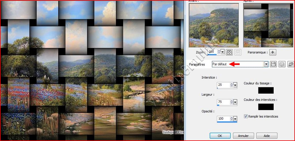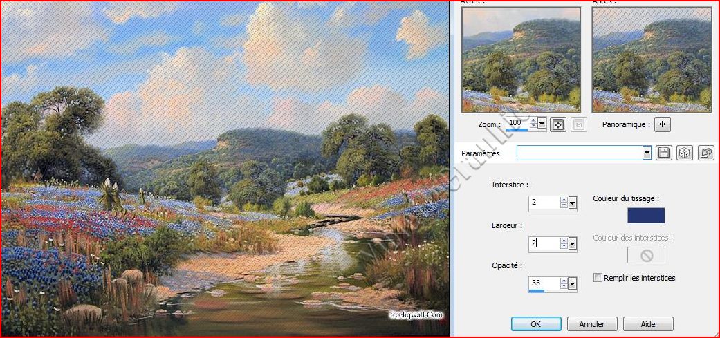 Interstice: permet de définir la taille en pixels de la zone située entre les fibres Largeur : permet de déterminer la largeur en pixels des fibres Couleur du tissage : permet de choisir la couleur du tissage Couleur des interstices : permet de choisir la couleur des interstices Opacité : permet de définir l’intensité de l’effet Remplir les interstices :permet de remplir la zone située entre les fibres avec une couleur Désactiver la case pour remplir les interstices avec l’image