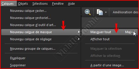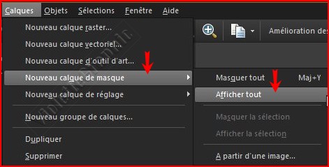 **Calques/ Nouveau calque de masque, puis l’une des options suivantes : **Masquer tout : masque tous les pixels sous-jacents