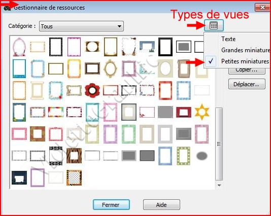 4 - En cliquant sur la case Types de vues cocher petites miniatures vous voyez alors facilement tous vos cadres