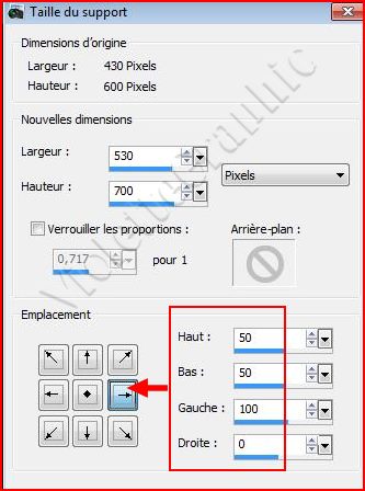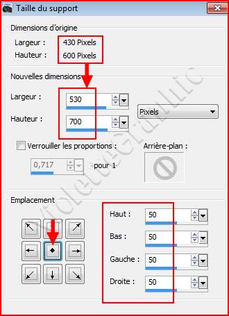 **dimensions d'origine : 430 x 600 pixels **Nouvelles dimensions : 530 x 700 pixels Entrez ou définissez des valeurs dans les zones suivantes Largeur et Hauteur Dans le pavé Emplacement, cliquez sur un bouton pour définir l’emplacement de l’image dans le nouveau support ou saisissez des valeurs dans les zones Haut, Bas, Gauche et Droite Les valeurs indiquent la quantité de support ajoutée ou soustraite sur chaque bord. Cliquez sur OK