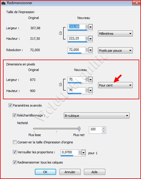 Dans la section Paramètres avancés, veillez à ce que la case Rééchantillonnage soit cochée L’option Rééchantillonner vous permet de préciser le nombre de pixels à modifier dans l’image. La méthode Bi-cubique est la plus lente, mais elle produit généralement de meilleurs résultats Dans la section Paramètres avancés, veillez à ce que la case Conserver la taille d’impression d’origine soit décochée et à ce que la case Verrouiller les proportions soit cochée Pour redimensionner une image en appliquant un pourcentage précis utilisez les zones du pavé Dimensions en pixels