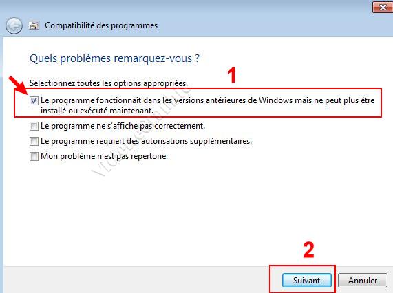1 - cocher le programme fonctionnait dans les versions antérieures de Windows mais ne peut plus être installé ou exécuter maintenant
