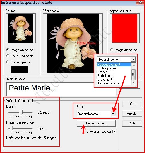 6 - Dans la case Définir l'effet spécial : définir la durée de l'animation Dans la case Effets : choisir l'effet souhaité