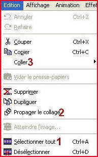 10 – revenir sur les images dupliquées : bien suivre cette procédure Edition/Sélectionner tout (1) Edition/Propager le collage( 2 ) Edition/Coller (3 )