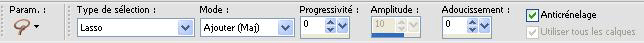 *** Ouvrir votre tube 1 - Supprimer la couche des références copyright 2 - Calques/Fusionner les calques 3 - Activer l'outil lasso configuré ainsi: