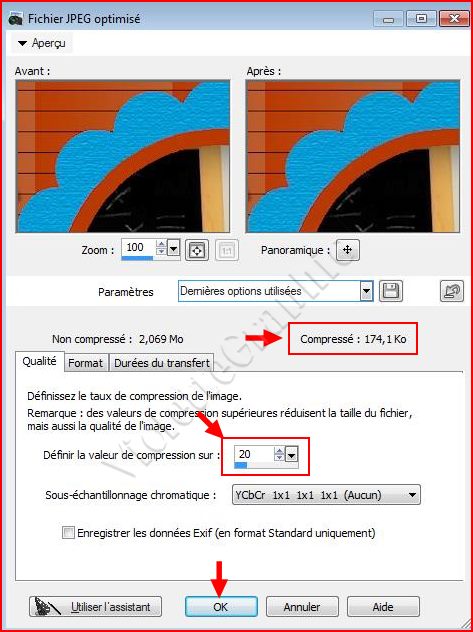 Placer la valeur de compression à 20 vous voyez à droite le poids final de votre image : cela vous permet de le contrôler