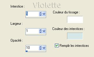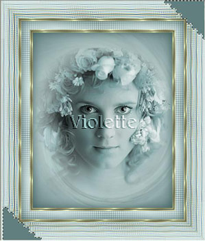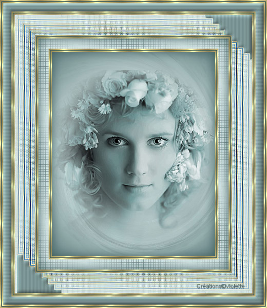 *** 1 - Ouvrir votre tube/le dupliquer et fermer l’original 2 – Installer la couleur claire #d6e7e7 en avant-plan et la couleur foncée #617f7e en arrière-plan 3 – Préparer en avant-plan un dégradé linéaire angle : 45° répétition : 1 case inverser cochée 4 - Ouvrir une image transparente de 400 x 500 pixels/Remplir de dégradé 5 – Activer le tube visage/ Image/redimensionner à 85% Edition/Copier/Edition/Coller comme nouveau calque Mode du calque : Luminance Héritée 6 - Dupliquer/Fermer la copie 7 - Se placer sur le tube original Image /redimensionner à 120 % deux fois Effets/ Effets de Distorsion/Torsion : 720 Mode du calque : Luminance Héritée Opacité : 50% 8 – Se placer sur le calque supérieur Effets/effets 3D/Ombre portée : 0/0/60/25 couleur #617f7e 9 - Dupliquer ce calque Mode du calque : Luminance 10 – Calques/Fusionner tout 11 - Sélection/sélectionner tout Effets/Effets 3D/Découpe : 0/0/100/40/#395958 Désélectionner 12 - Image/Ajouter des bordures : 3 pixels couleur noires/ Sélectionner avec la baguette magique Remplir de motif or/ Désélectionner 13 - Image/Ajouter des bordures : 2 pixels couleur #395958 14- Image/Ajouter des bordures : 3 pixels couleur #noire/Sélectionner avec la baguette magique Remplir de motif or/ Désélectionner 15 - Image/Ajouter des bordures : 25 pixels couleur #617f7e/Sélectionner avec la baguette magique Remplir de dégradé linéaire angle 45° répétitions : 7 case inverser cochée 16 – Effets/Effets de textures/textile :