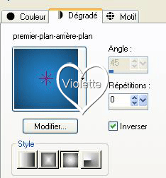 Matériel : Deux tubes ICI Des coins Filtres Simple Xero Graphic PLus ICI *** 1 - Ouvrir vos tubes les dupliquer et fermer les originaux 2 – Installer en avant-plan la couleur #183f60 et en arrière-plan la couleur #258bd5 3 - Ouvrir une image de 350 x 450 pixels transparente/remplir de dégradé halo :