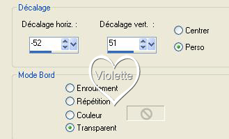 17 – Sélectionner avec la baguette magique/remplir avec la tuile 18 – Sélection/Inverser 19 – sélection/Transformer la sélection en calque 20 - Effets/Effets 3D/Ombre Portée : 2/2/80/25/couleur foncée/refaire avec –2 Désélectionner 21 – Effets/Effets d’images/décalage :