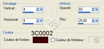 refaire avec vertical et horizontal à –4 Désélectionner 18 - Image/Ajouter des bordures : 1 pixel couleur #3c0002 19, 20, 21 et 22 -Refaire les n° 15,16,17 et 18 deux fois 23 - Image/Ajouter des bordures : 1 pixel couleur #3c0002 24 – Activer votre tube coins/Edition/Copier/Edition/Coller comme nouveau calque Image/Redimensionner à 50% Réglages/Netteté/Davantage de Netteté Placer sur le coin gauche 25 - Effets/Simple/Top left Mirror 26 – Effets/ Effets 3D/Ombre Portée : 1/1/80/1/ couleur #3c0002 27 ,28 et 29 – Refaire les n° 24 , 25 et 26 mais en redimensionnant à 70% 30 - Signer 31 - Exporter en JPEG Optimisé 80%.