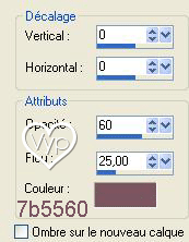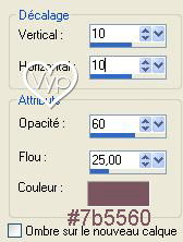 11 - Image/Ajouter des bordures : 1 pixel couleur #7b5560 12 – Dupliquer 13 – Image/Redimensionner à 80% 14 - Effets/Effets 3D/Ombre Portée :