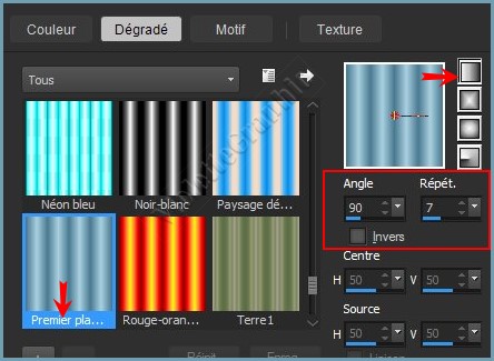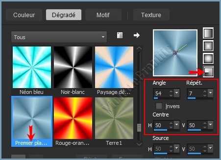 Configurer un dégradé radial angle: 54°/Répétitions: 7/Inverser coché
