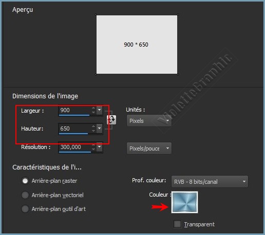 3 - Fichier/Nouvelle image 900 x 650 pixels  et choisissez immédiatement le dégradé