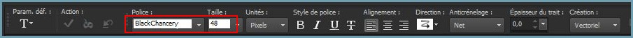 20 - Activer l'outil  Texte/Police Black Chancery/taille : 48/ vectoriel/crénage : 50