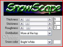 1 - Ouvrir une image transparente de 300 x 200 pixels remplir de couleur noire Calques /Nouveau calque 2 - Activer l'outil texte /Police large au choix /taille à votre convenance Couleur rouge et entrer votre texte : et Effets / VMD Adrénaline/ Snowscape: