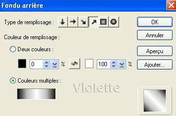2 – Installer la couleur foncée #3c4A70 en avant-plan, et la couleur claire #CCDBEF en arrière-plan 3 – Ouvrir une image fond blanc 450 x 500 pixels Edition/remplir de couleur foncée Edition/Fondu arrière /n°7/diagonale