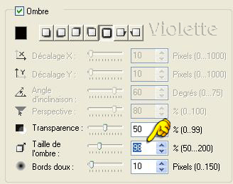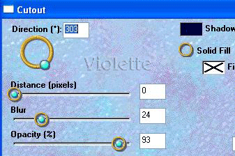 6 – Photo/Affiner/Affiner : cocher la 3ème case clic droit/Désélectionner 7– Activer le tube/Ajuster/Redimensionner à 90%/ Edition/Copier/ Edition/CollerPhoto/Mise au point/Option/ Ajustement auto/OK Objet/Ombre : la 1ème par défaut 8 – Objet/Fusionner tout 9 – clic droit/Tous Sélection/Inverser Eye Candy 3.01/Cutout /couleur de l’ombre noir