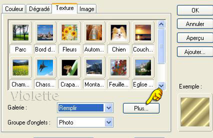 1 - Enregistrez la texture tuile63.bmp : Installer une texture Enregistrez la texture or dans vos fichiers : Dans la palette magique, Clic droit sur un des dossiers (peu importe lequel), Ajouter une diapo de remplissage. Indiquez le chemin de la texture or enregistrée. Celle-ci s'ajoute dans Ma galerie