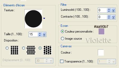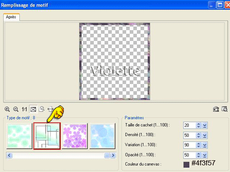 20 - Ajuster/Etendre le canvas/ cocher « Etendre les côtés de façon égale » : 30 pixels couleur #aea9c6 Sélectionner avec la baguette magiqueEffets/Remplissage et textures/Remplissage de motif motif 8 /couleur du fond #4f3f57