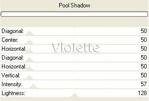 Clic droit/Désélectionner 10 - Calque/Fusionner Tout 11 – clic droit/Tous 12 - Sélection/Inverser ( on ne voit plus rien ) 13 - Eye Candy 3.01/Cutout /valeurs par défaut /couleur de l’ombre : noire 14 - Ajuster/Etendre le canvas/ cocher « Etendre les côtés de façon égale » : 3 pixels couleur blanche Sélectionner avec la baguette magique/Dans la Palette Magique/Double-cliquer sur la texture or perle Clic droit/sans 15- Ajuster/Etendre le canvas/ cocher « Etendre les côtés de façon égale » : 15 pixels couleur #4f3f57 16- Effets/Graphic Plus/ Cross Shadow par défaut/ Refaire une seconde fois Clic droit/Désélectionner 17 - Ajuster/Etendre le canvas/ cocher « Etendre les côtés de façon égale » : 3 pixels couleur rouge Sélectionner avec la baguette magique/Dans la Palette Magique/Double-cliquer sur la texture or perle Clic droit/sans 18 - Ajuster/Etendre le canvas/ cocher « Etendre les côtés de façon égale » : 15 pixels couleur #e6dfeb Sélectionner avec la baguette magique 19 - Greg’s Factory Output Vol.2 /Pool Shadow :